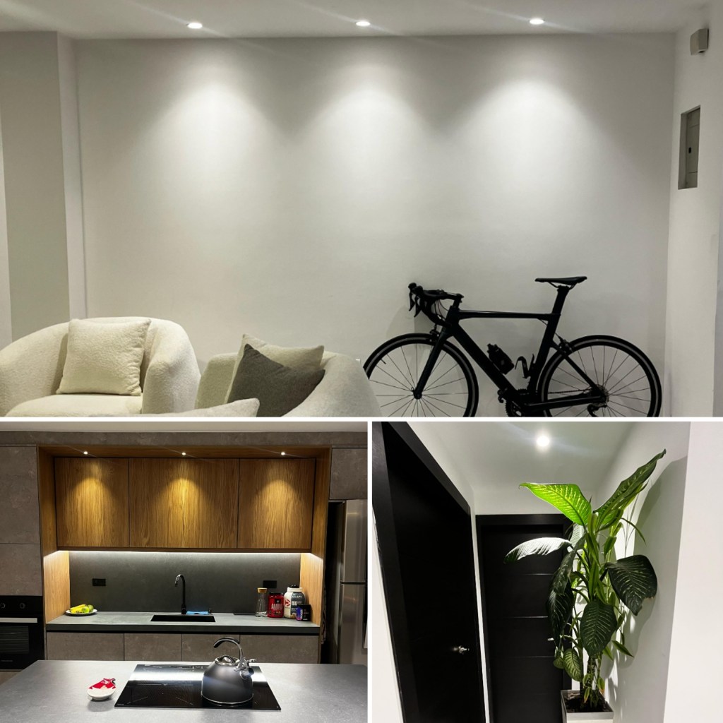 👆Un concepto de iluminación que proclama «menos es mas» usamos fuentes de iluminación como paneles led, ojos de buey led y cinta led; es decir formas limpias, lineales y sutiles. Adicional independizamos circuitos de cada una de las fuentes y así tener un efecto de luz para cada una de ella y como resultado una iluminación homogénea y acogedora y elegante💡